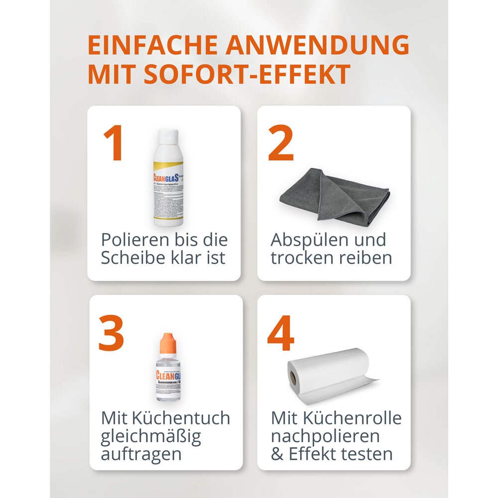 CleanglaS findet nur auf rückstandsfreien Untergründen gute Haftung. Verwenden Sie zur Vorreinigung bei leichter Verschmutzung einen geeigneten Glasreiniger bzw. bei stärkerer Verschmutzung eine Glasreinigungspolitur. Bei Verkalkungen z.b. auf der Duschwand verwenden Sie einen für das Material geeigneten Entkalker. Anwendung im Innenbereich oder bei trockenem Wetter über 5 Grad C. auch Aussen möglich. ( idealer Molekularanhaftung zwischen 10 und 25 Grad). Glasflächen nach Reinigung und Entfernung aller Bindungsverhindernden Restanten mit Wasser nachwaschen und sehr gut trocknen. CleanglaS Glasversiegelungs Konzentrat mit geeignetem nicht fusselndem Auftragstuch z.B. Küchenrolle gleichmäßig, am besten kreuzweise auftragen. Mit trockenem Tuch nachwischen und mit Wasser nachspülen - Fertig. In unserer Videothek sehen Sie auch eine Videoanleitung.