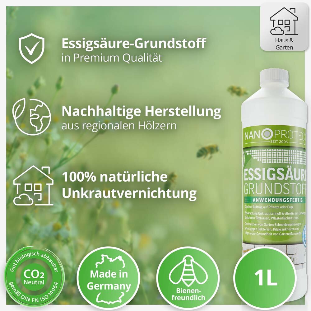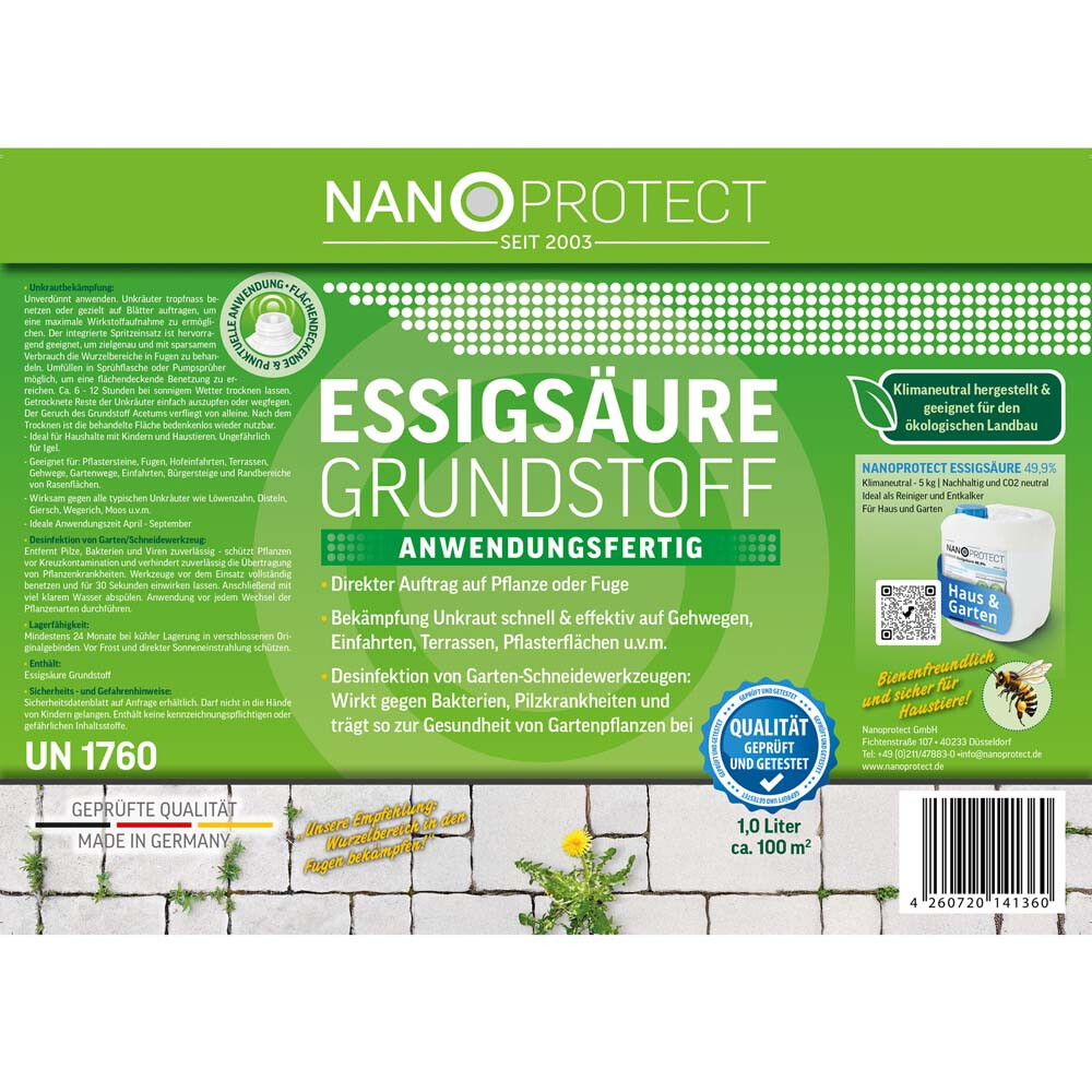 Nanoprotect Unkrautvernichter | Essigsäure Grundstoff | 1 L | Spritzeinsatz für zielgenaue Behandlung | Extra stark ohne Glyphosat | Für Fugen, Wege, Einfahrten, Terrasse und Pflasterflächen