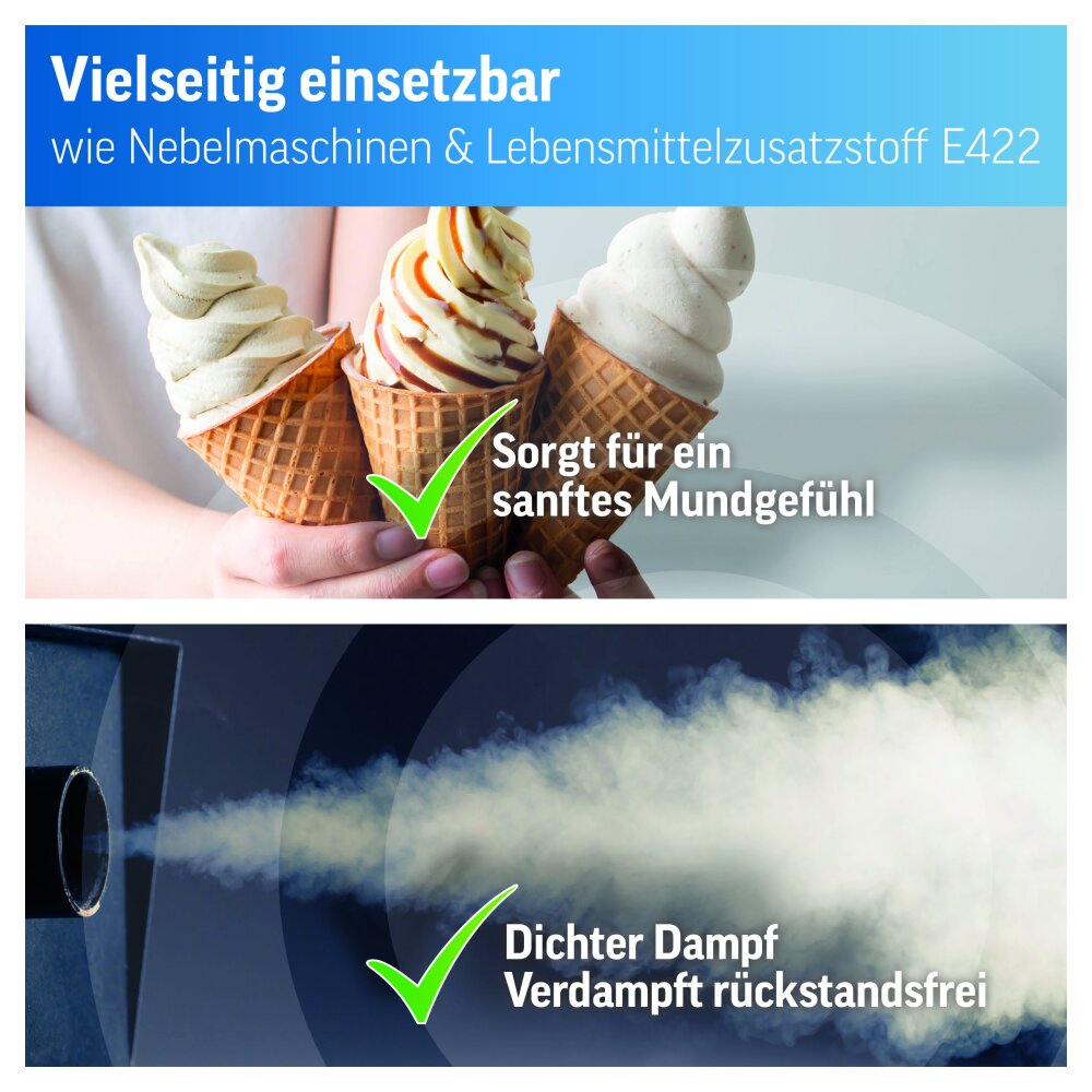 - Rückstandsfrei: Da das Glycerol absolut sauber verdampft, schont es technische Geräte und hinterlässt keine Ablagerungen auf empfindlichen Bauteilen (wie z.B. Coils in Nebelmaschinen).