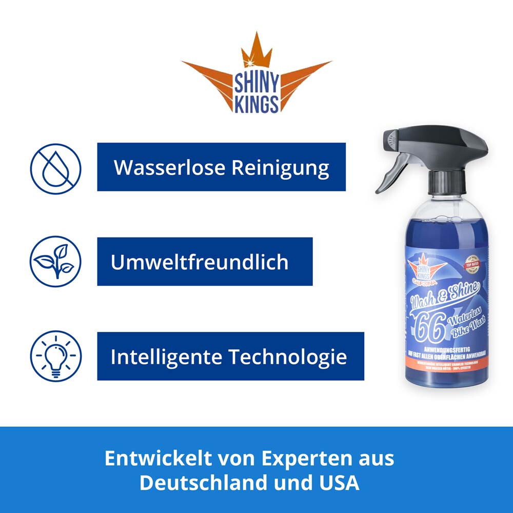 Shinykings Wash & Shine | BIKE Schnellreiniger | Wasserloser Insektenentferner und Trockenwäsche mit Hochglanz | 4 x 0,5 Liter + 4 x Reinigungstücher